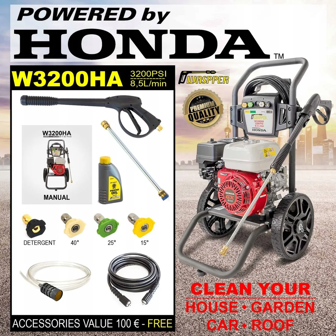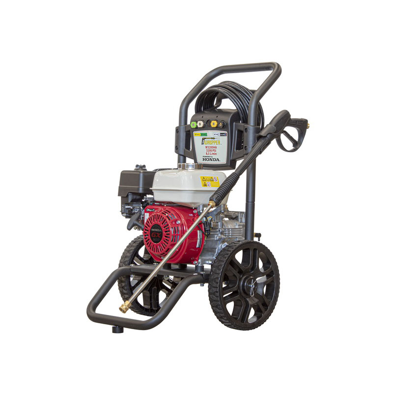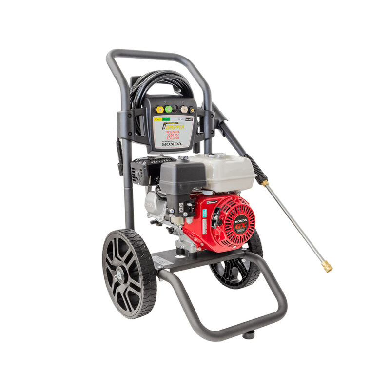 Myjka ciśnieniowa W3200HA. Wysoka wydajność czyszczenia dzięki technologii silnika Honda GX200. Zapewnia niesamowity efekt czyszczenia. Trwała konstrukcja. Całkowicie metalowa pompa z mosiężną obudową gwarantuje długą żywotność.